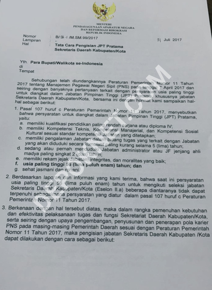 Dalam Surat MenPAN-RB yang ditujukan kepada Bupati/Walikota se Indonesia itu disebutkan, apabila pengisian jabatan Sekretaris Daerah Kabupaten/Kota melalui Seleksi secara terbuka dan kompetitif tidak terpenuhi calon yang memenuhi syarat baik secara kuantitas (jumlah) maupun persyaratan lainnya termasuk batas usia (56 tahun), maka Bupati/Walikota selaku Pejabat Pembina Kepegawaian (PPK) dapat melakukan mutasi/rotasi diantara pejabat pimpinan tinggi pratama (eselon II/b) baik di lingkungan Pemerintah Daerah yang bersangkutan maupun dari Kabupaten/Kota lain dalam satu provinsi.
