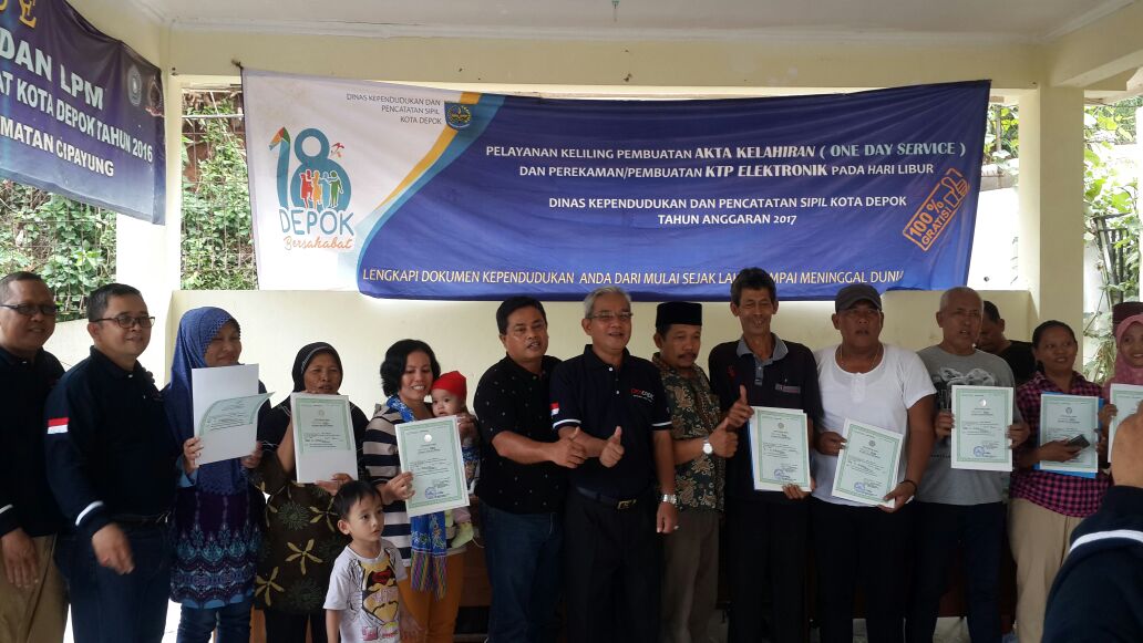 Melalui program One Day Service (ODS) berupa pelayanan akte catatan sipil di hari libur, Disdukcapil kota Depok kembali menggelar program ODS di kelurahan Pondok Jaya kecamatan Cipayung, Sabtu (12/08/2017).