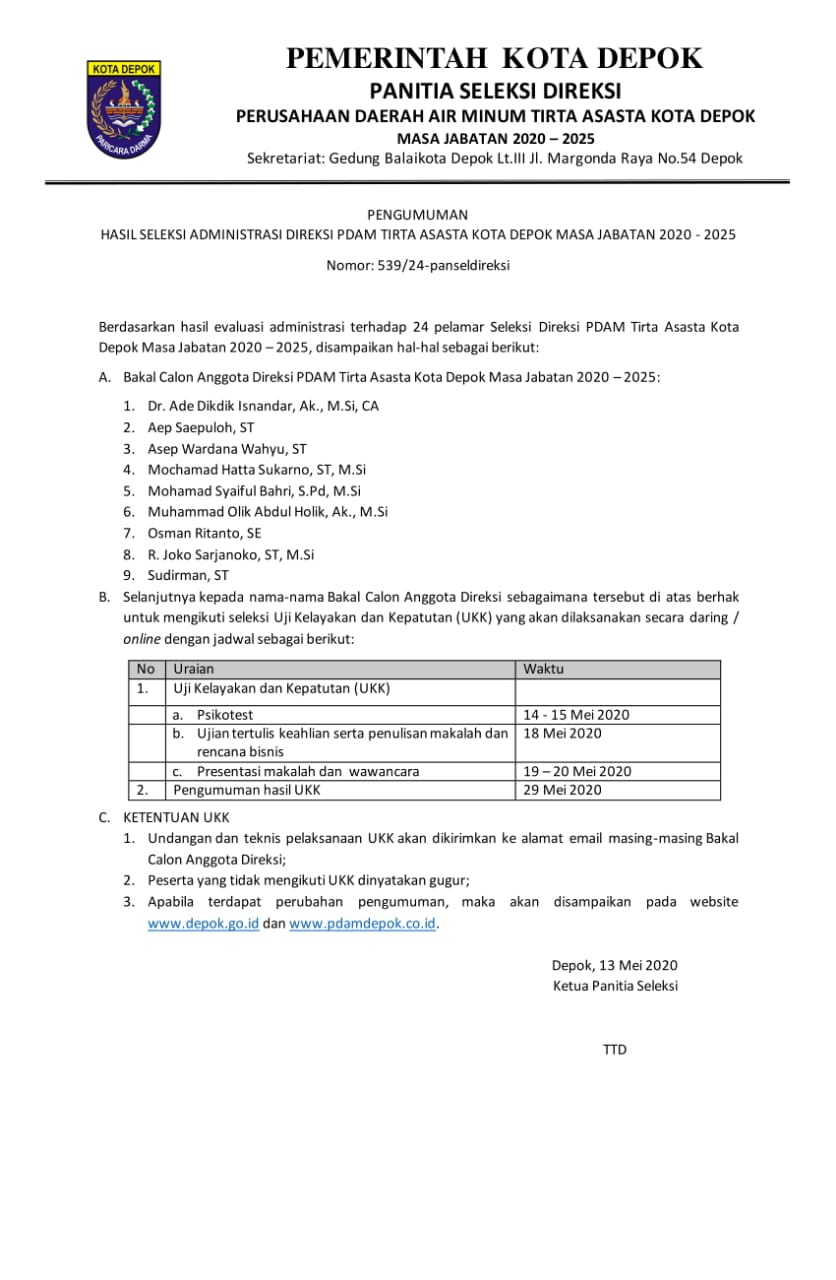 Berikut ini nama 9 orang peserta Seleksi Direksi PDAM Tirta Asasta Kota Depok masa bhakti 2020-2025 yang dinyatakan lulus seleksi administrasi.