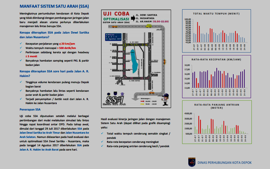 DEPOKNET – Dinas Perhubungan (Dishub) kota Depok merilis hasil evaluasi kinerja jaringan jalan dengan penerapan Sistem Satu Arah (SSA) di jalur jalan Nusantara, Dewi Sartika, Arif Rahman Hakim, serta ruas jalan lain yang terhubung dengan SSA seperti Kartini, Siliwangi, Raya Sawangan dan Margonda.