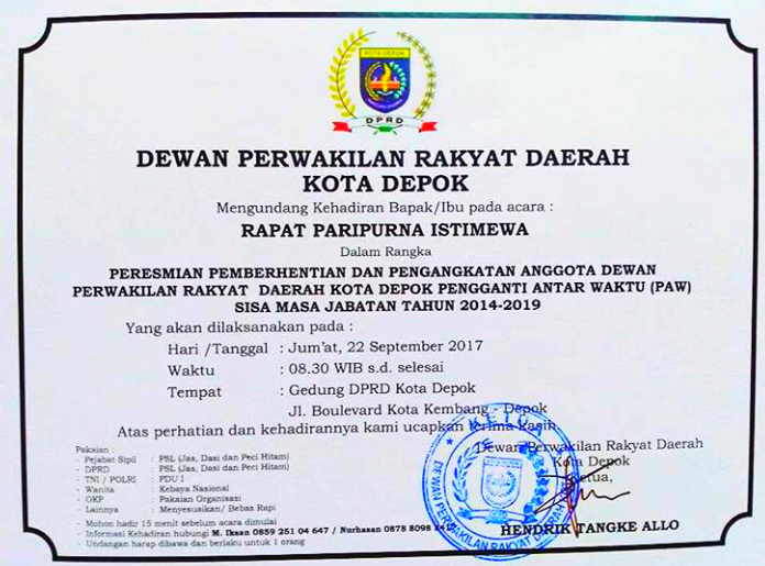Atas dasar itu, DPRD Kota Depok telah menjadwalkan Rapat Paripurna Istimewa dalam rangka Peresmian Pemberhentian dan Pengangkatan Anggota Dewan Perwakilan Rakyat Daerah Pengganti Antar Waktu Kota Depok sisa masa jabatan 2014-2019 yang akan digelar, Jumat (22/09/2017) pagi.