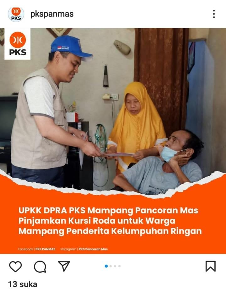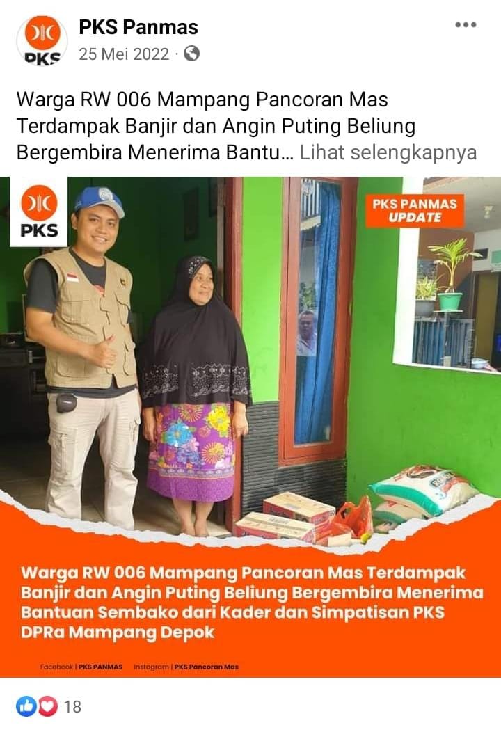 Pada dinding postingan itu ada tulisan “Warga RW 06 Mampang Pancoranmas terdampak banjir dan angin puting beliung bergembira menerima bantuan sembako dari kader dan simpatisan PKS DPRa Mampang Depok”. Disitu juga ada foto Amri Joyonegoro berdampingan dengan warga terdampak banjir yang menerima bantuan.