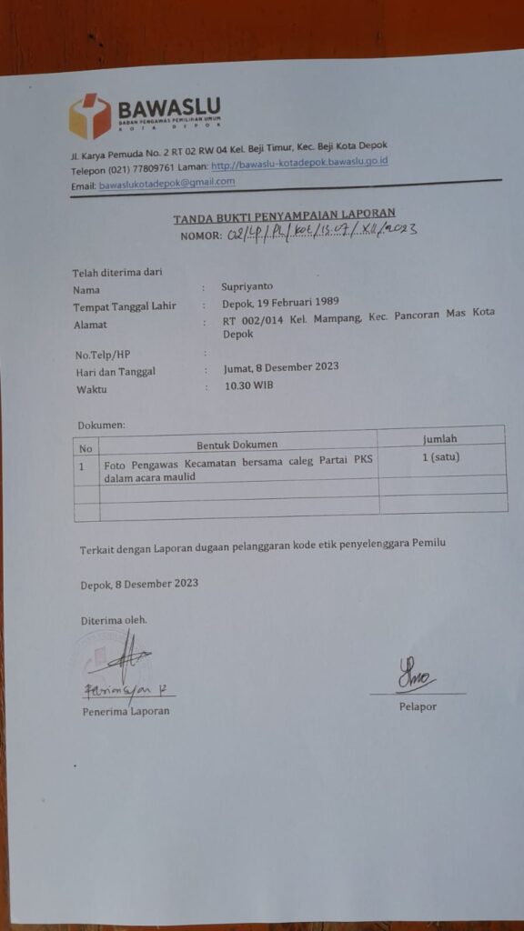 Atas dasar temuan tersebut, warga RT 002 RW 014 Kelurahan Mampang yang biasa disapa Randy Kebo ini melaporkan Amri Joyonegoro kepada Bawaslu Kota Depok.