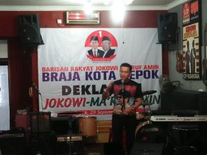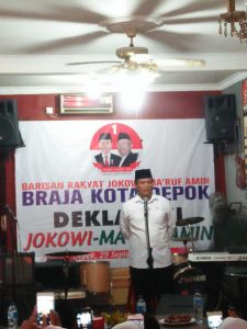 DEPOKNET – Demi memastikan kemenangan pasangan calon presiden dan wakil presiden Republik Indonesia, H. Joko Widodo dan KH. Ma’ruf Amin dalam kontestasi Pemilihan Umum tahun 2019, beberapa elemen masyarakat kota Depok mendeklarasikan terbentuknya BRAJA (Barisan Rakyat H. Joko Widodo – KH. Ma’aruf Amin), di Jalan Nusantara Raya, Beji kota Depok, Sabtu (29/09).