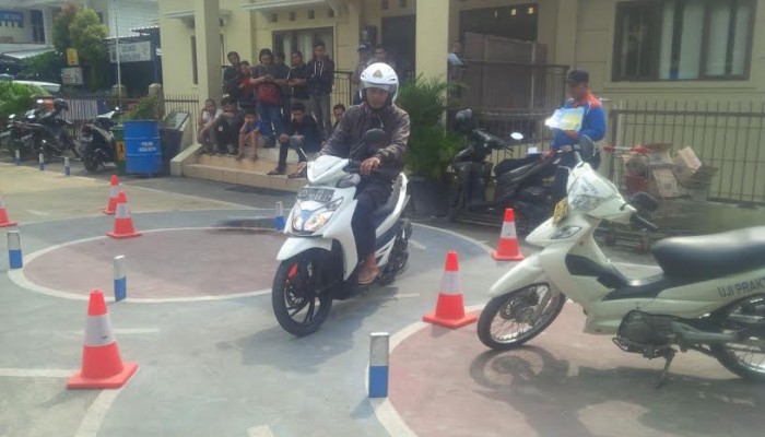 Petugas Satpas SIM sedang menguji peserta pemohon SIM ujian praktek. (Angga)