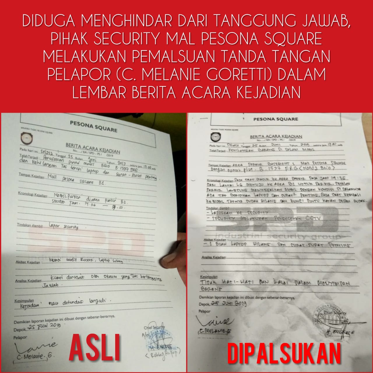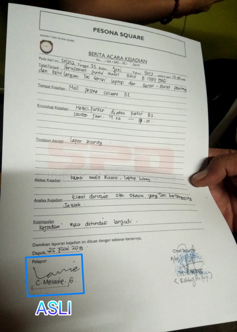 Melanie menduga, tanda tangannya telah berani dipalsukan oleh petugas Security Mal Pesona Square karena petugas Security ingin menghindar dari tanggung jawab atas kejadian pembobolan mobilnya itu.