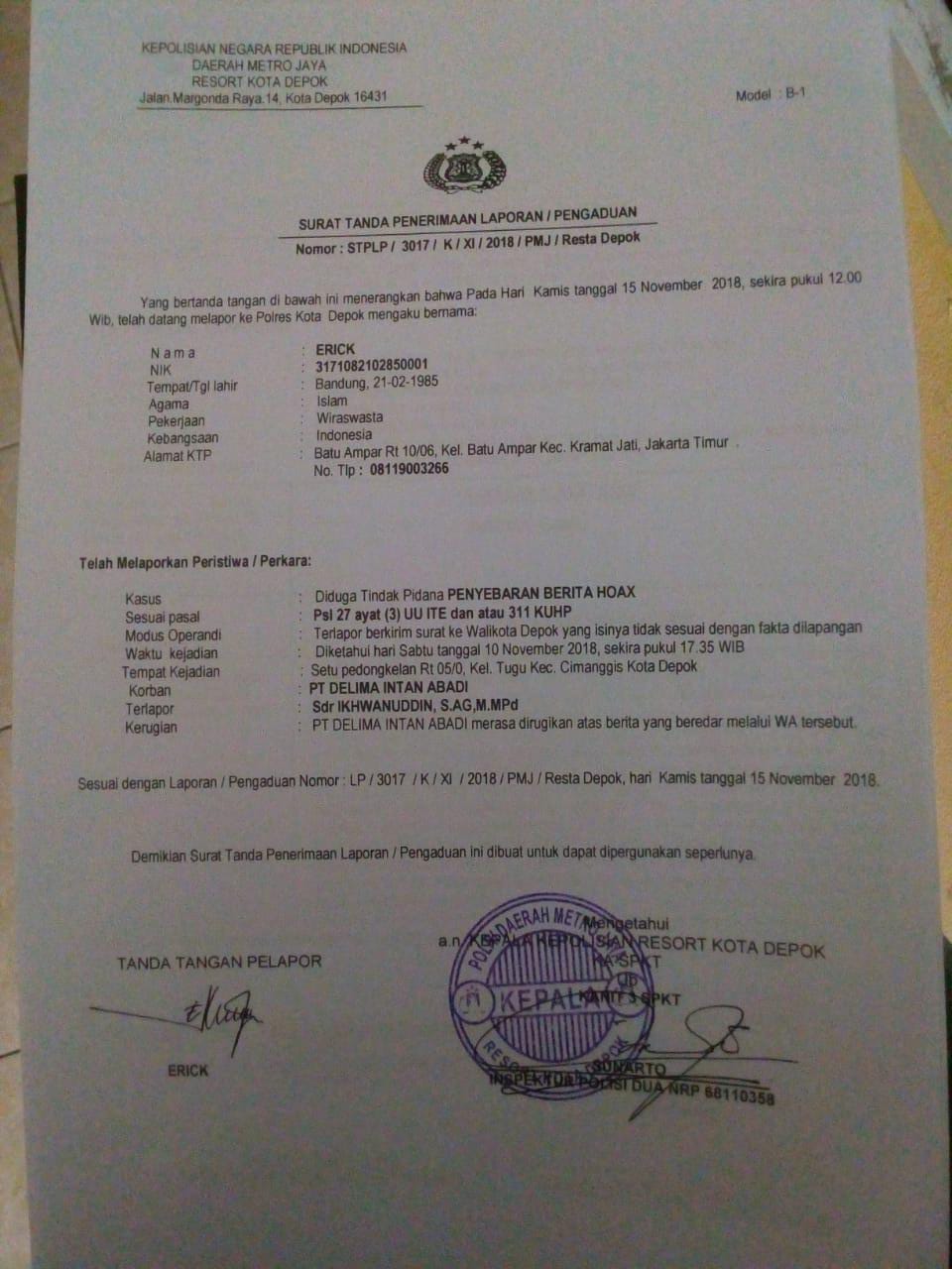 “Selain itu, dirinya juga menyebarkan surat laporan dan tuduhannya itu ke beberapa grup WhatsApp sehingga menyebar luas,” ungkap Erick, dari PT Delima Intan Abadi, kepada depoknet.com, Rabu (28/11/2018).