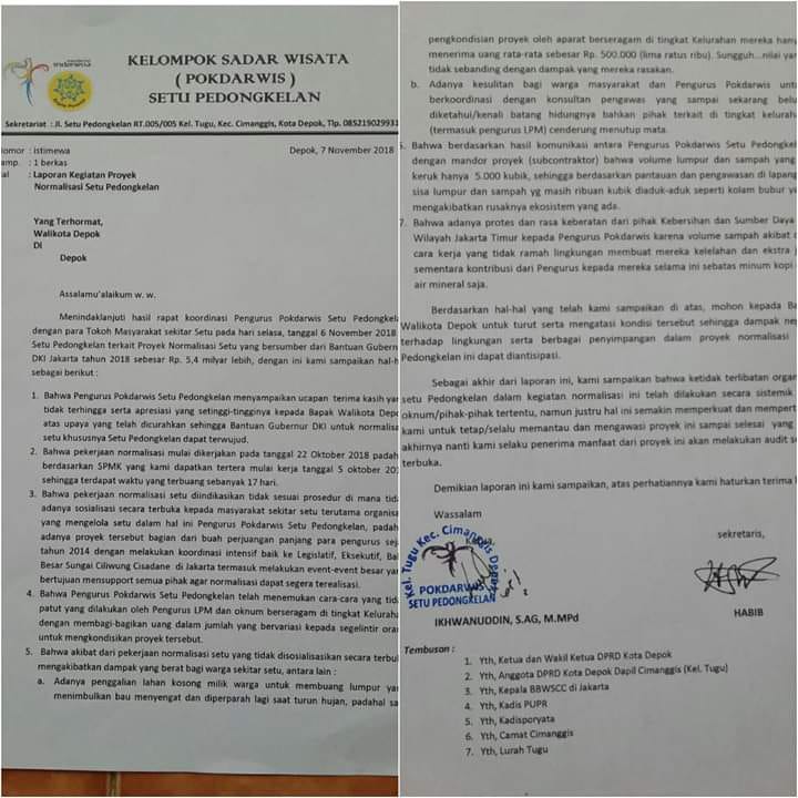 Dari informasi yang diterima DepokNet, laporan berawal dari terlapor berkirim surat kepada Walikota Depok terkait pelaksanaan kegiatan penataan Situ Pedongkelan Kelurahan Tugu Kecamatan Cimanggis yang isi suratnya diyakini pihak pelapor tidak sesuai dengan fakta di lapangan.