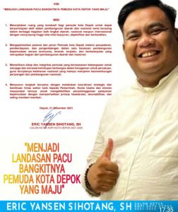 Dengan mengusung Visi “Menjadi Landasan Pacu Bangkitnya Pemuda Kota Depok Yang Maju”, Eric Yansen Sihotang dalam salah satu misinya berjanji akan mengoptimalkan potensi dan peran Pemuda kota Depok melalui penyadaran, pemberdayaan, dan pengembangan dalam satu kesatuan pembangunan kepemudaan secara terencana, terarah, terpadu, dan berkelanjutan.