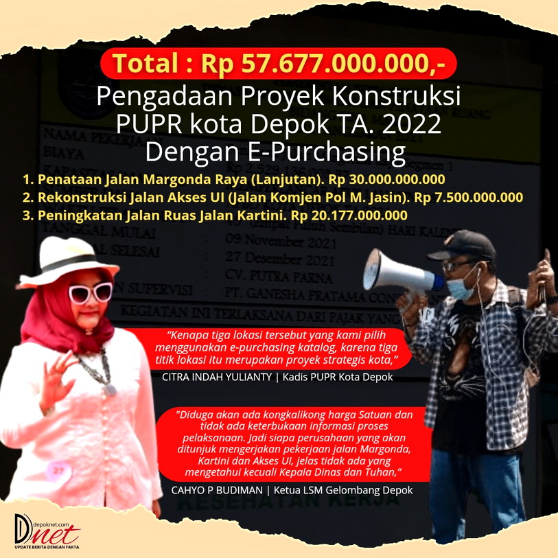 Menanggapi penjelasan Kadis PUPR Depok tersebut, Ketua LSM Gerakan Lokomotif Pembangunan (Gelombang) kota Depok, Cahyo P Budiman mengatakan, jawaban Kadis yang menyebut metode e-purchasing bisa cepat adalah untuk mengalihkan kinerja PUPR Kota Depok yang anjlok.