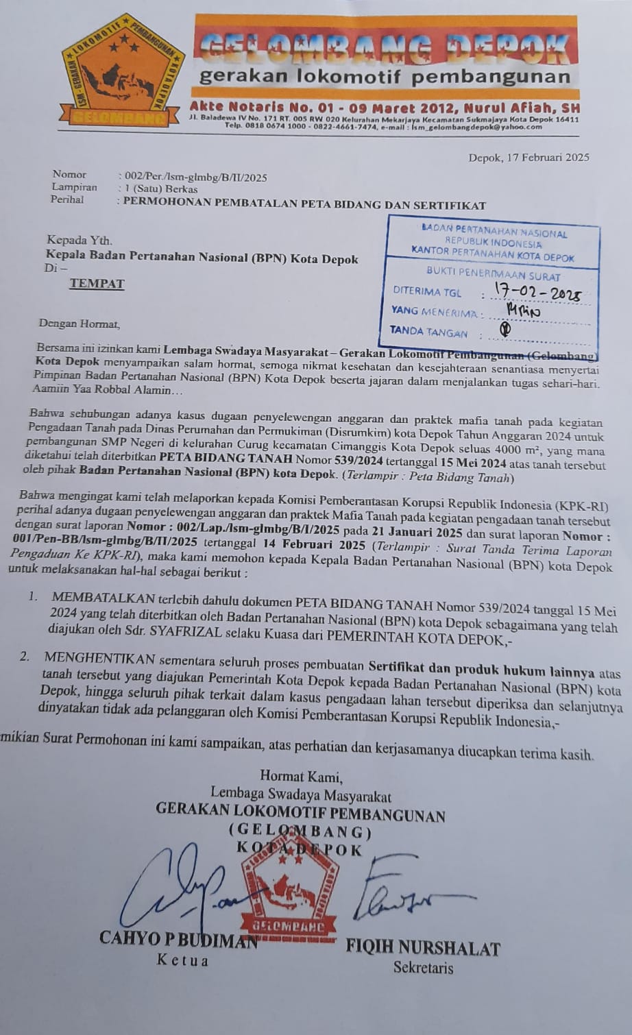 Merespon fakta tersebut, LSM Gelombang Depok melayangkan surat kepada BPN Kota Depok agar membatalkan dokumen Peta Bidang Tanah sebagaimana yang telah diajukan oleh Syafrizal selaku Kuasa dari Pemerintah kota Depok.