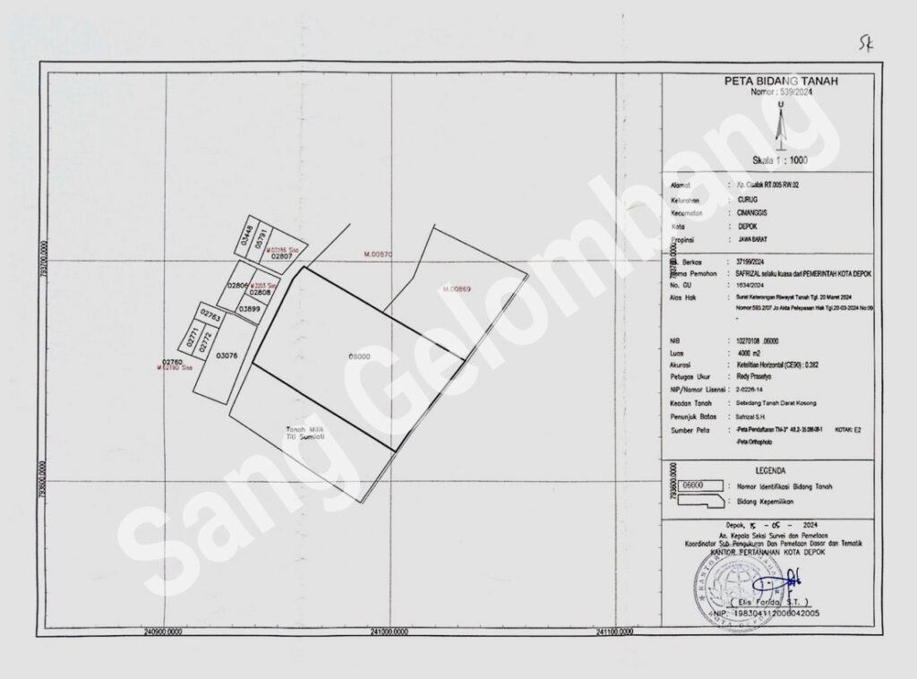 Namun diketahui, Badan Pertanahan Nasional (BPN) kota Depok telah menerbitkan PETA BIDANG TANAH atas tanah tersebut dengan Nomor 539/2024 tertanggal 15 Mei 2024.