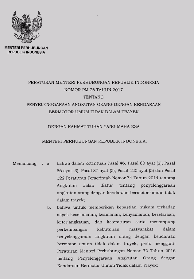 DEPOKNET – Gugatan dan permohonan uji materiil kepada Mahkamah Agung (MA) terhadap sejumlah pasal dalam Peraturan Menteri Perhubungan Nomor PM 26 Tahun 2017 tentang Penyelenggaraan Angkutan Orang dengan Kendaraan Bermotor Umum Tidak dalam Trayek yang diajukan sedikitnya 6 orang yang kesemuanya adalah pengemudi angkutan sewa khusus akhirnya dikabulkan oleh Majelis Hakim Agung MA.
