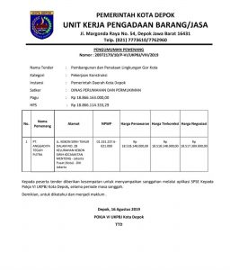 Untuk diketahui, pekerjaan konstruksi pembangunan dan penataan lingkungan GOR kota Depok Tahun Anggaran 2019 ini dilaksanakan oleh Dinas Perumahan dan Permukiman (Disrumkim) kota Depok. Sementara pemenang kegiatan yang dilakukan melalui proses lelang berdasarkan data pengumuman lelang LPSE Kota Depok tertanggal 16 Agustus 2019 adalah PT. Anggadita Teguh Putra dengan nilai penawaran Rp 18.518.148.000,-. (CPB/DepokNet)