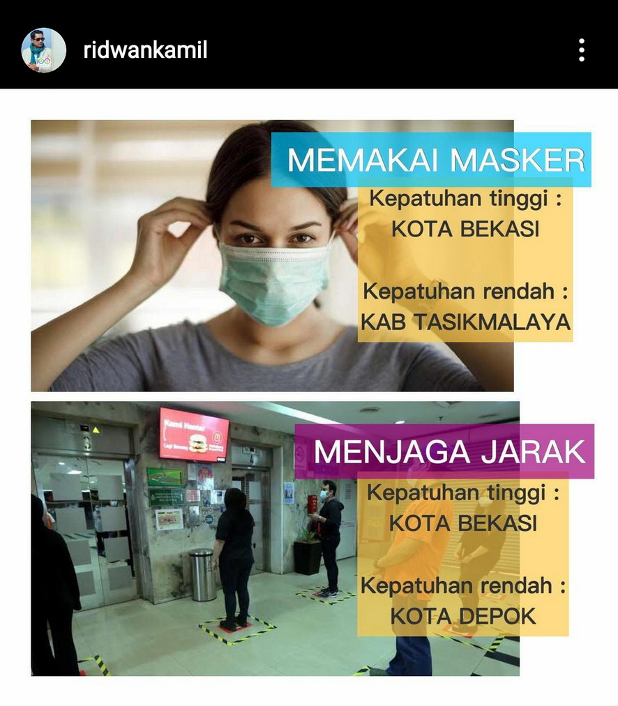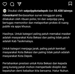 Tak hanya itu, Kang Emil sapaan Gubernur Jawa Barat berusia 50 tahun itu, juga menyebut di akun Instagram pribadinya jika data yang disampaikannya diperoleh dari “survei mingguan yang dilakukan ribuan polisi, TNI, dan Satpol PP, yang bertugas memonitor dan melaporkan prokes di ruang publik via apps (aplikasi) khusus”.