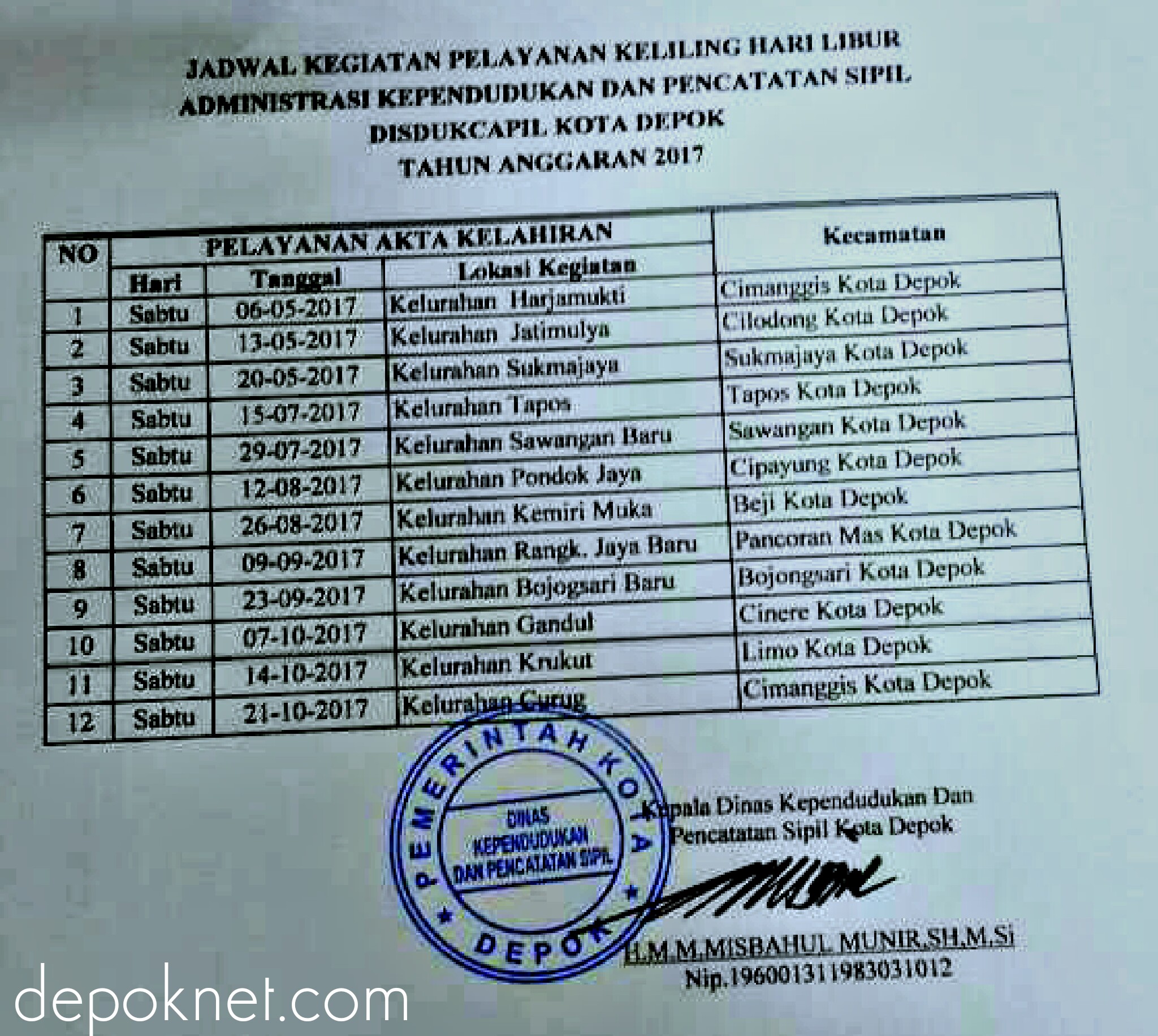 Sesuai jadwal kegiatan yang telah dibuat, pelayanan akta kelahiran di hari libur kali ini digelar di Kelurahan Jatimulya Kecamatan Cilodong Kota Depok, Sabtu (13/05/2017)