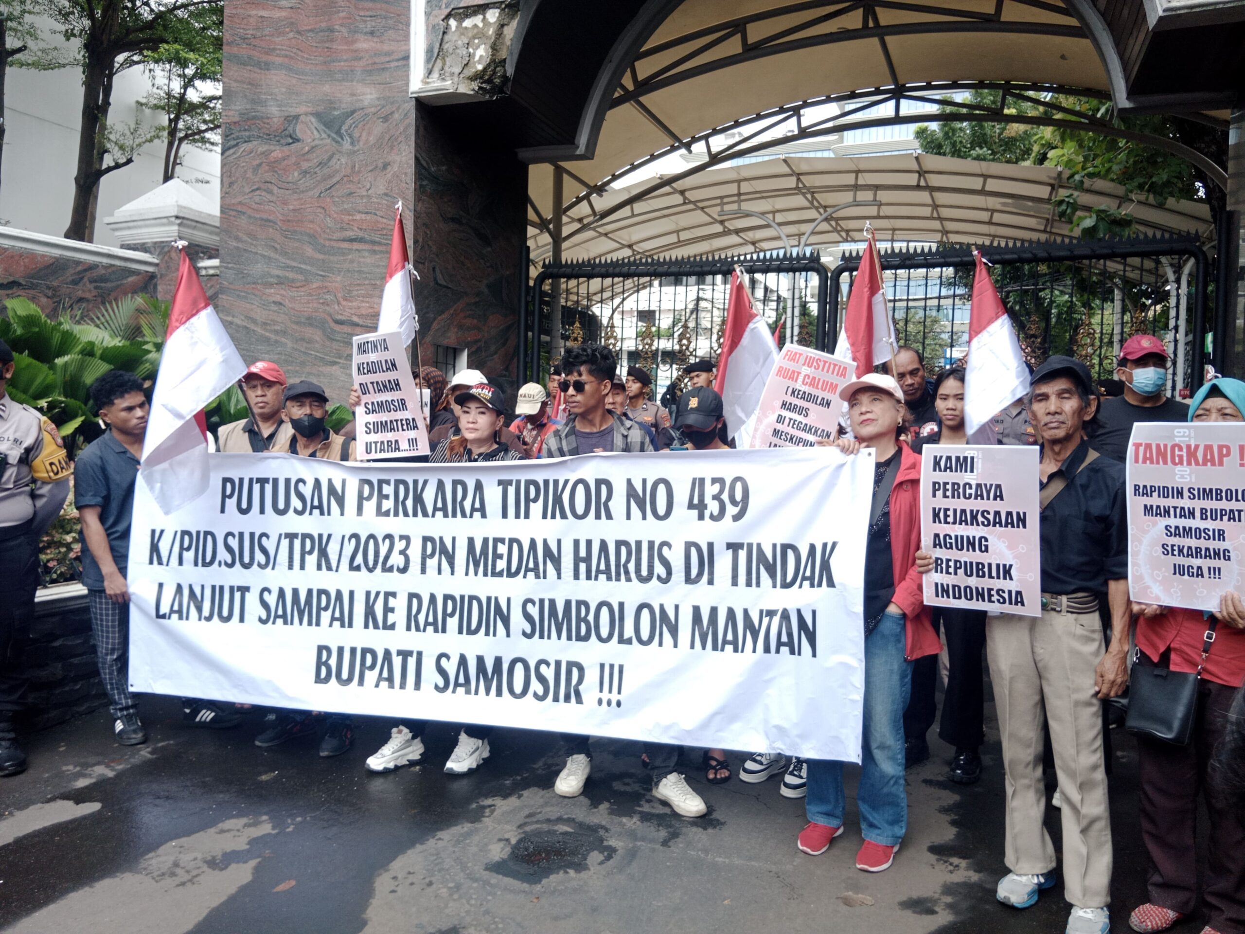 “Kita sudah melihat bahwasannya hukum adalah panglima tertinggi di Indonesia. Untuk itu, Kejaksaan Agung RI supaya segera menangkap mantan Bupati Samosir, Rapidin Simbolon yang saat ini duduk di komisi XIII DPR-RI,” ucap Oscar dalam orasinya.
