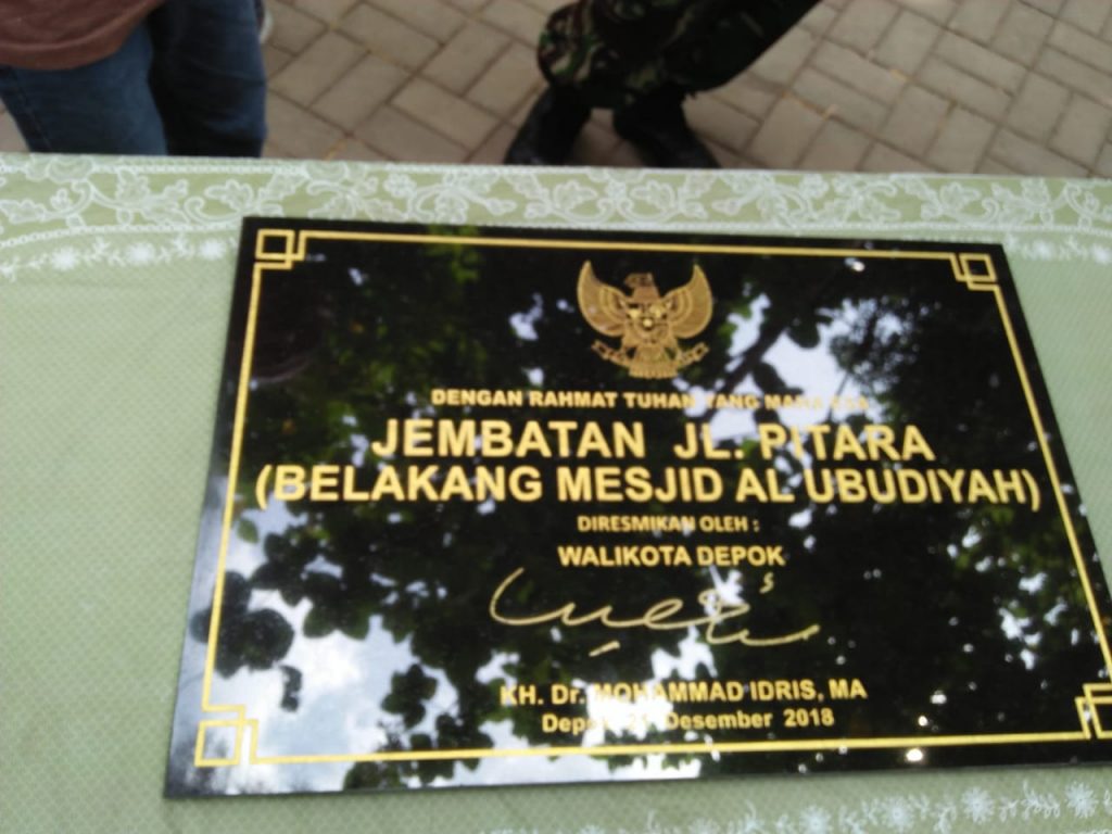 DEPOKNET – Disebut lebih cepat 3 hari dari waktu yang diberikan, pekerjaan proyek pembangunan jembatan Jalan Pitara (belakang masjid Al Ubudiyah) kecamatan Pancoran Mas diresmikan oleh Walikota Depok, Mohammad Idris, Jumat (21/12/2018).