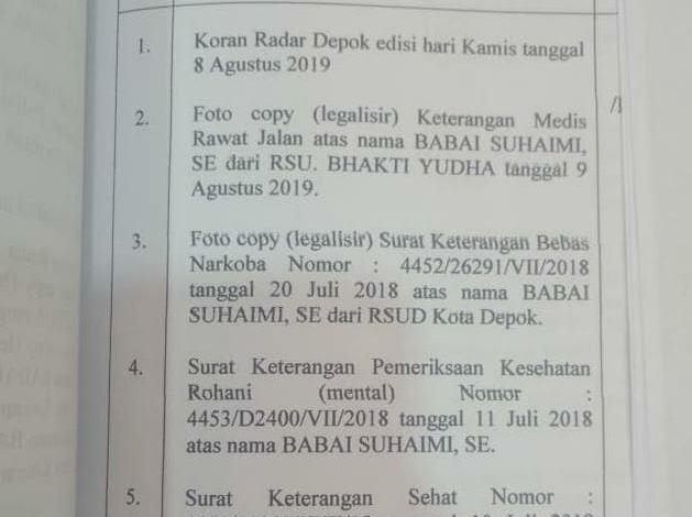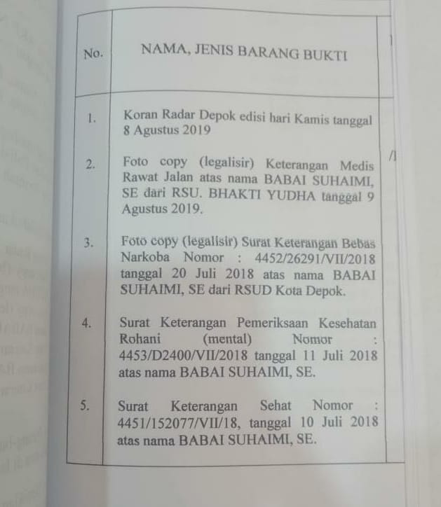 Ada 5 jenis barang bukti yang diserahkan penyidik, salah satunya foto copy (legalisir) surat keterangan bebas narkoba Nomor : 4452/26291/VII/2018 tanggal 20 Juli 2018 atas nama BABAI SUHAIMI, SE dari RSUD Kata Depok.
