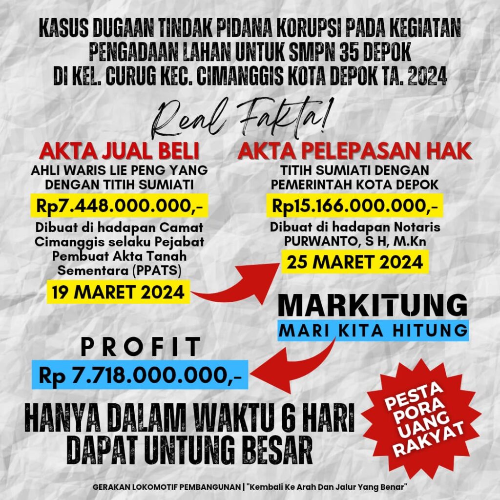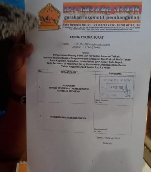 DEPOKNET – Setelah bekerja ektra keras mencari dan mengumpulkan bukti-bukti terkait dugaan penyelewengan anggaran dan praktek mafia tanah pada kegiatan Pengadaan Tanah untuk pendirian SMP Negeri di kelurahan Curug kecamatan Cimanggis Tahun Anggaran 2024, LSM Gerakan Lokomotif Pembangunan (Gelombang) kota Depok memenuhi komitmennya dengan mengirimkan bukti tambahan dan perbaikan laporan ke Komisi Pemberantasan Korupsi Republik Indonesia, Jumat (14/02)
