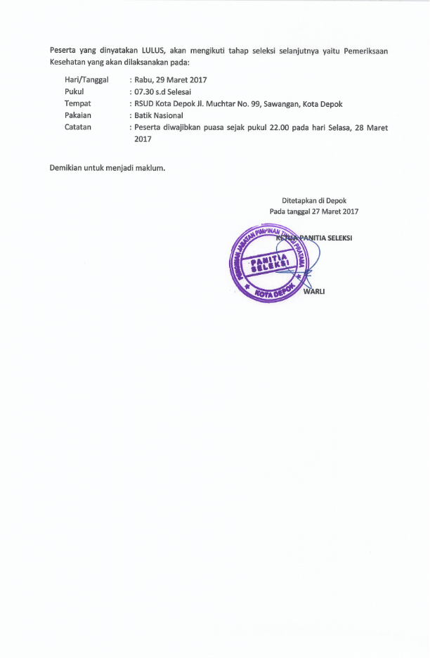 13 peserta yang dinyatakan Lulus seleksi administrasi tersebut selanjutnya akan menjalani pemeriksaan kesehatan di Rumah Sakit Umum Daerah (RSUD) kota Depok, Rabu, 29 Maret 2017 mulai pukul 07:30 WIB.