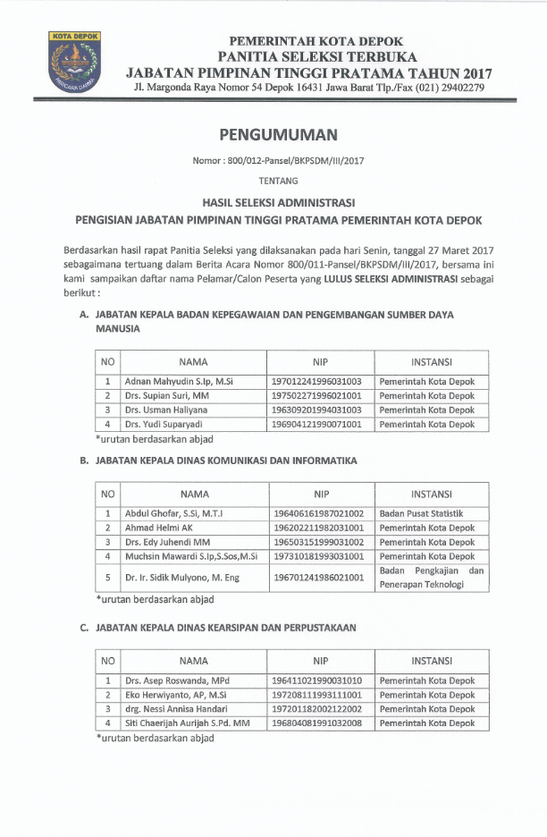 DEPOKNET – 13 nama pelamar atau calon peserta dinyatakan Lulus seleksi administrasi dalam Seleksi Terbuka pengisian Jabatan Pimpinan Tinggi (JPT) Pratama Pemerintah Kota Depok tahun 2017. Keputusan ini berdasarkan hasil rapat Panitia Seleksi (Pansel) yang digelar Senin, 27 Maret 2017 dan termuat dalam Berita Acara nomor 800/011-pansel/BKPSDM/III/2017.