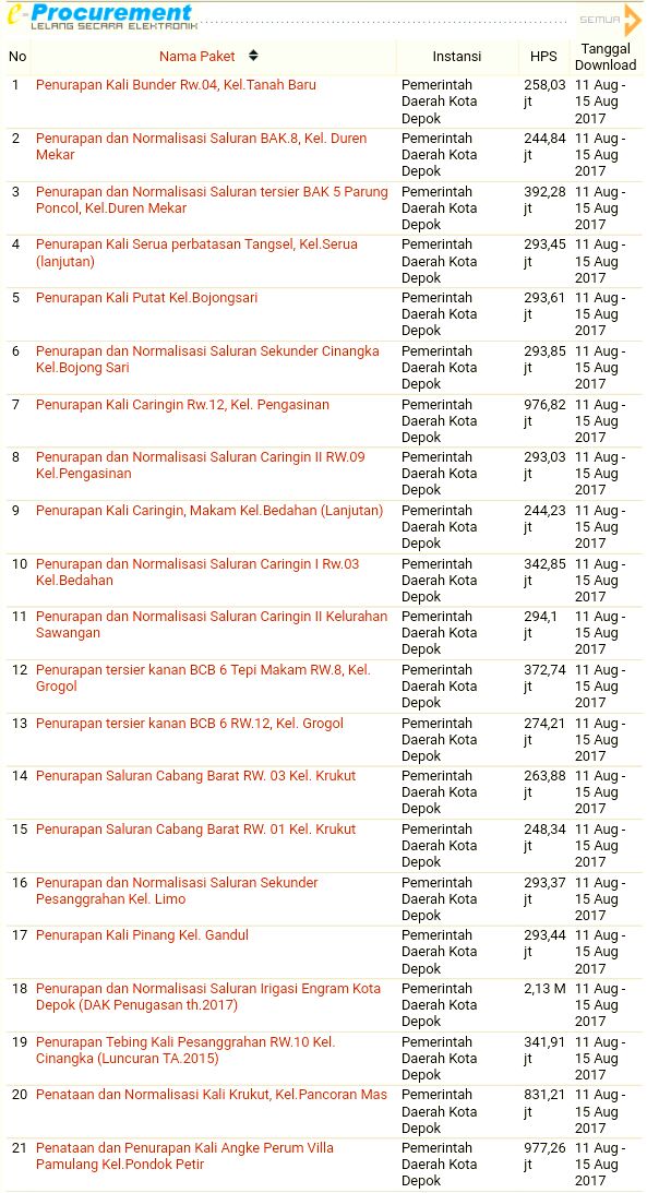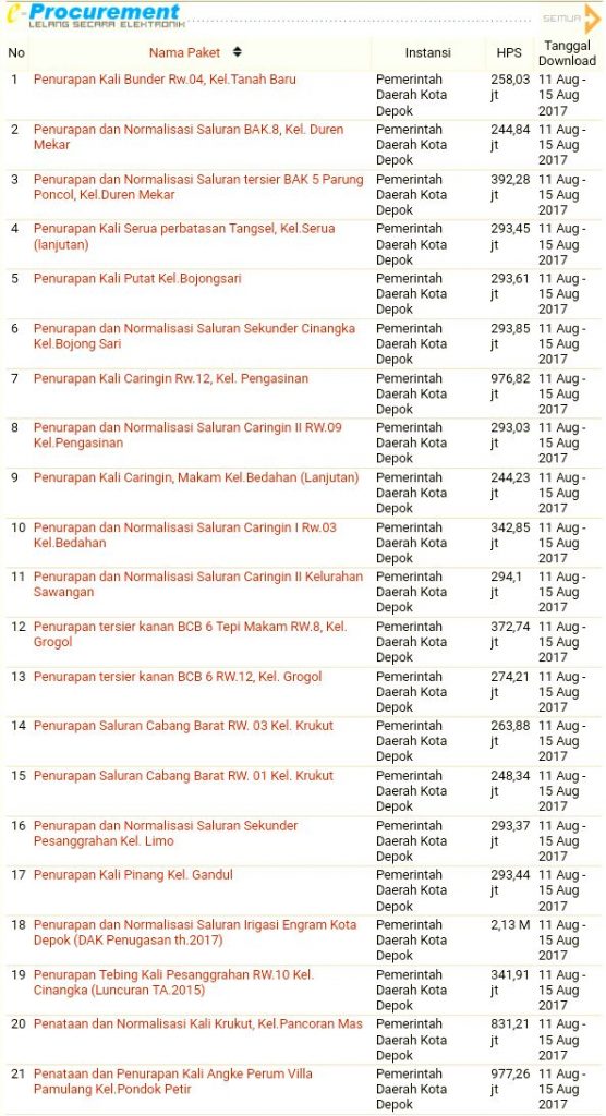 DEPOKNET – Unit Layanan Pengadaan (ULP) kota Depok mulai Jumat lalu (11/08/2017) telah menggelar kegiatan lelang pekerjaan bidang Sumber Daya Air (SDA) pada Dinas Pekerjaan Umum dan Penataan Ruang (DPUPR) kota Depok.
