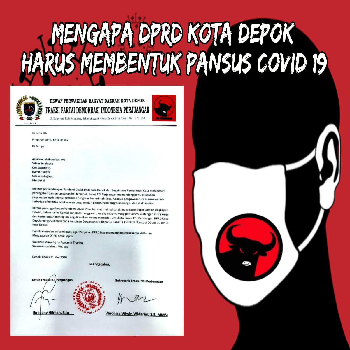 Menimbang berbagai persoalan yang diuraikan di atas maka Fraksi PDI Perjuangan DPRD Kota Depok mengusulkan pembentukan Panitia Khusus Covid 19 (Pansus Covid 19). Sebaga alat kelengkapan Dewan yang bersifat sementara, pembentukan Pansus harus mempertimbangkan keterwakilan Komisi-komisi dan badan-badan di DPRD selain keterwakilan Fraksi. Dengan demikian Pansus bisa mengatasi kendala sektoral yang dimiliki oleh Alat Kelengkapan Dewan yang ada selama ini. Pengawasan pun bisa dilakukan lebih fokus dan menyeluruh. Inilah yang kami maksudkan dengan memaksimumkan Fungsi Pengawasan.