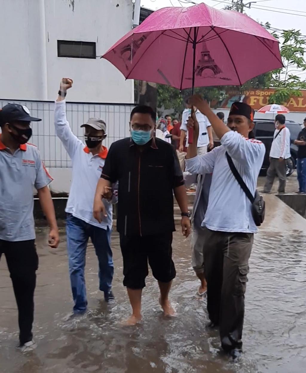 DEPOKNET – Hujan deras yang mengguyur kota Depok tak menyurutkan calon Wali Kota Depok, Pradi Supriatna untuk menemui warga kelurahan Curug kecamatan Cimanggis, Rabu (21/10/2020)