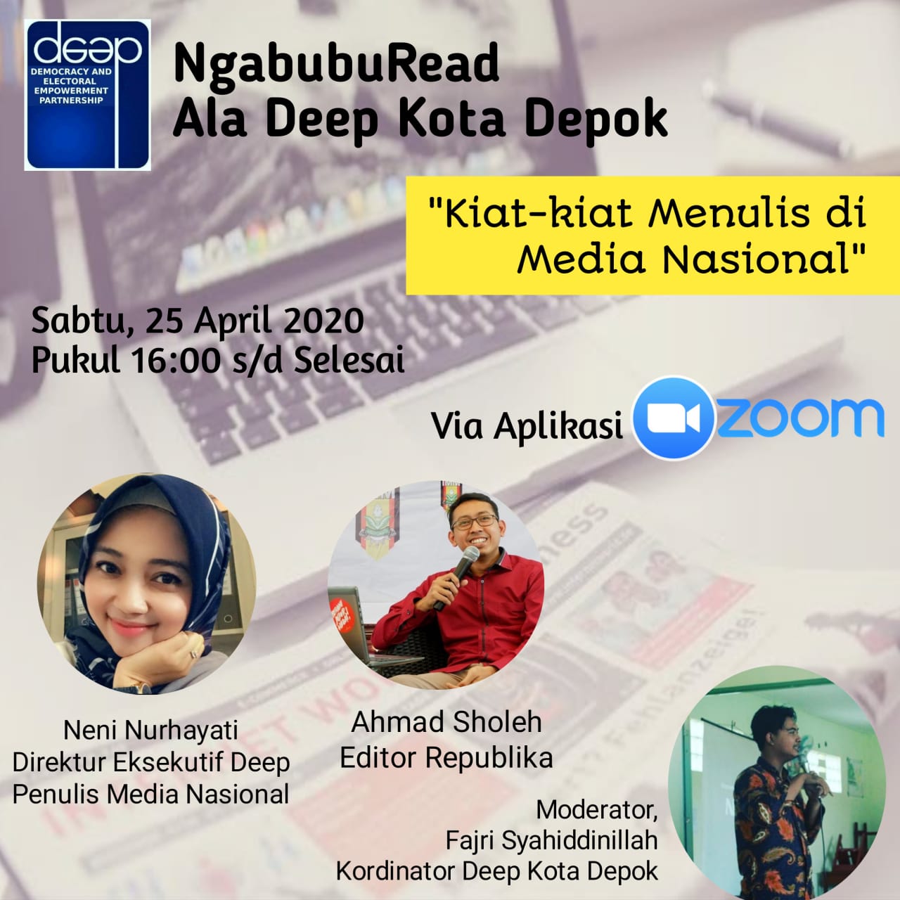 depoknet.com – Sabtu,25 April 2020 DEEP (Democracy And Elektoral Empowerment Partnership) Kota Depok mengadakan kegiatan Ngabuburit sembari menunggu buka puasa dengan nama kegiatan Ngabuburead Ala Deep Depok. tema Ngabuburead Ala Deep Depok kali ini adalah Kiat-kiat menulis di berbagai Media Nasional.