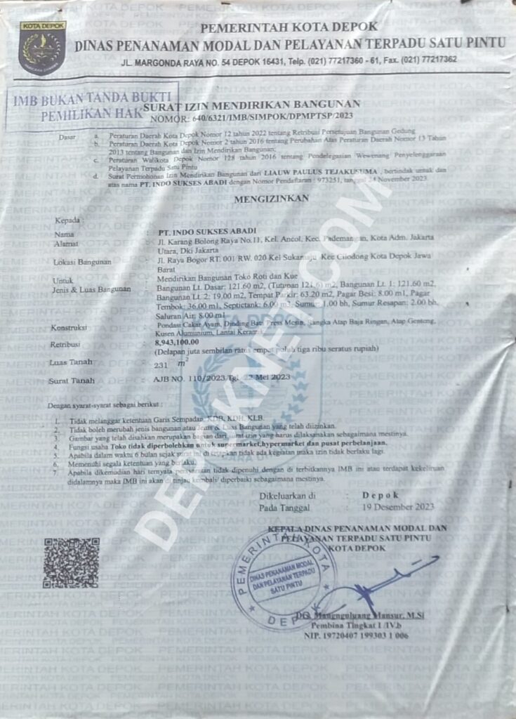 Dipaparkan Kasno, bangunan outlet Holland Bakery jelas tidak sesuai dengan gambar Izin Pemanfaatkan Ruang (IPR) Nomor 593.2/449/IPR/SIMPOK/2023 Tanggal 23 september 2023 yang telah diterbitkan oleh Dinas Penanaman Modal dan Pelayanan Terpadu Satu Pintu Kota Depok.