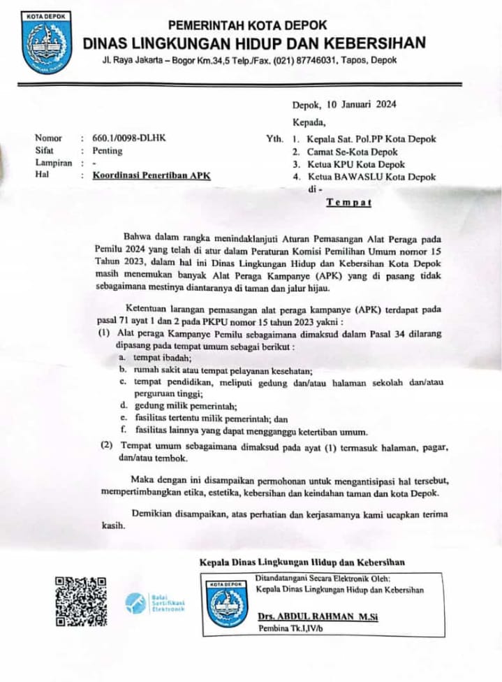 Panwaslu kecamatan Pancoran Mas dalam pemberitahuannya tertanggal 24 Januari 2024 menyebutkan, berdasarkan hasil kajian terhadap fakta, bukti dan keterangan, bahwa kepala dinas Lingkungan Hidup dan Kebersihan kota Depok atas nama Drs. Abdul Rahman, M.Si telah terbukti melakukan pelanggaran.
