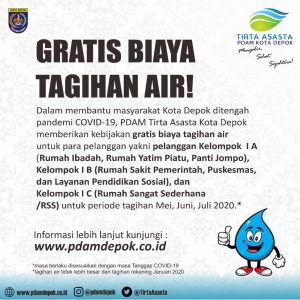 Selain untuk pelanggan umum, khusus untuk Pelanggan PDAM Kelompok I semua golongan, PDAM Tirta Asasta Kota Depok juga memberikan kebijakan gratis biaya tagihan air.