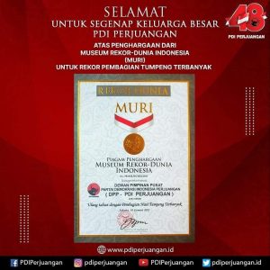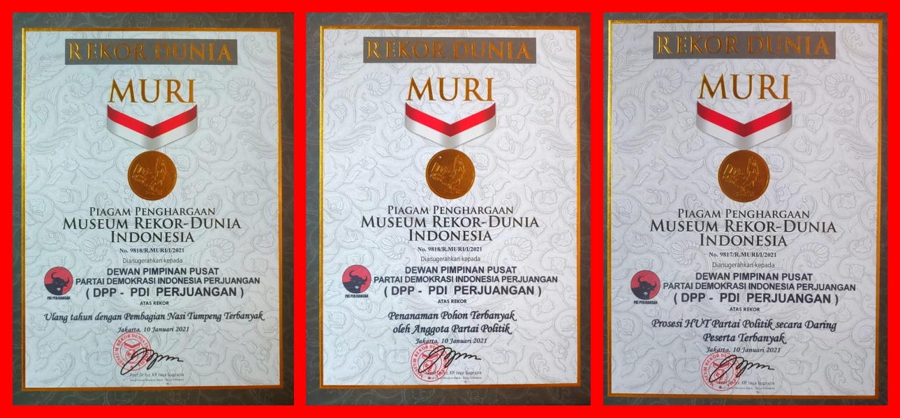 Piagam Penghargaan MURI dengan nomor 9818/R-MURI/I/2021 diterbitkan pada 10 Januari 2021 tepat pada HUT ke 48 PDI Perjuangan dan ditandatangani oleh pendiri MURI, Jaya Suprana.