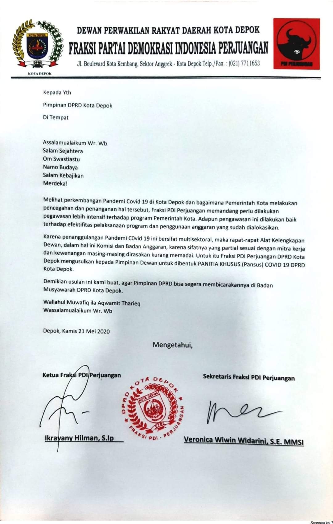 DEPOKNET – Partai Demokrasi Indonesia Perjuangan melalui fraksinya di DPRD kota Depok mengusulkan pembentukan Panitia Khusus (Pansus) Covid 19 DPRD kota Depok. PDI Perjuangan memandang perlunya pengawasan yang lebih intensif terhadap program penanganan Cofid 19 yang dilakukan Pemerintah Kota (Pemkot) Depok.