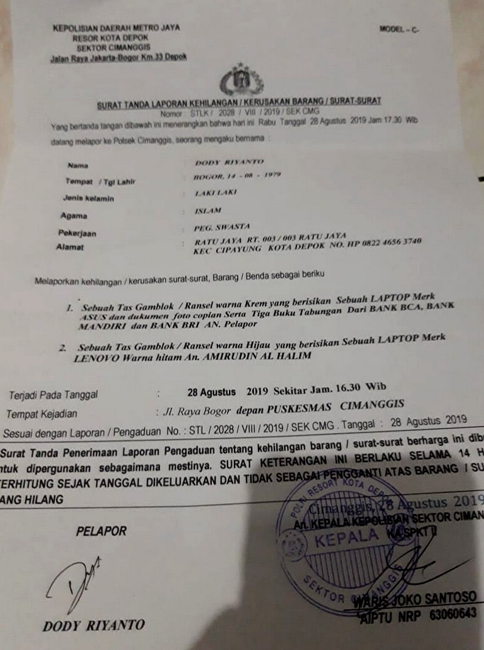 Dalam kejahatan ini, pelaku membawa kabur 2 buah tas ransel berisi laptop dan dokumen penting lainnya yang ada di dalam mobil milik korban yang terparkir di depan UPT Puskesmas Cimanggis, Depok.