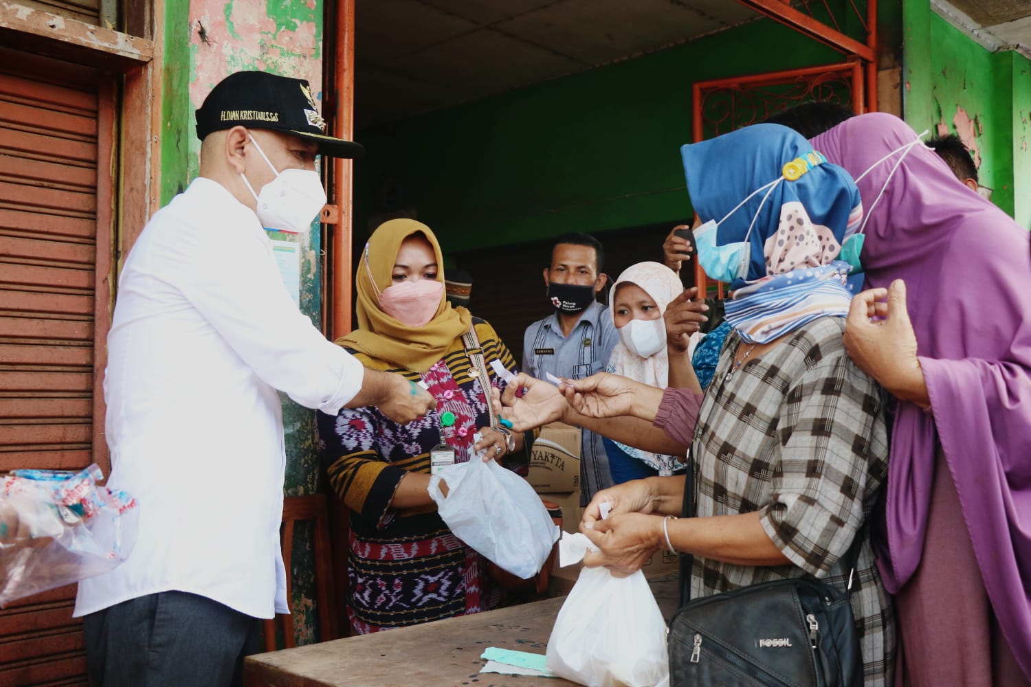 Dian Kristiandi, turun tangan membantu petugas untuk membagikan minyak goreng kepada masyarakat yang berada di Pasar Mlonggo dan Pasar Bangsri. Ikut mendampingi Kepala Dinas Perindustrian dan Perdagangan Kabupaten Jepara, Eriza Rudy Yulianto, Kabag Perekonomian Setda Jepara, Nurjannah.