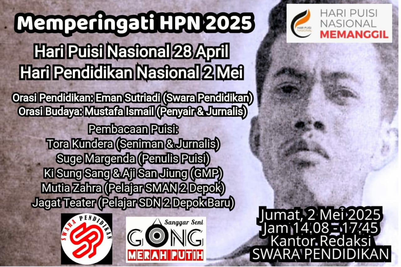DEPOKNET – Dalam rangka memperingati Hari Puisi Nasional dan Hari Pendidikan Nasional 2025, Perkumpulan Seniman Gong Merah Putih bekerjasama dengan SWARA PENDIDIKAN, menggelar acara sastra dan orasi budaya pada Jumat 2 Mei 2025 di Kantor Redakasi Swara Pendidikan di Jalan Gelatik 5 Kelurahan Depok Jaya, Pancoran Mas, Kota Depok.