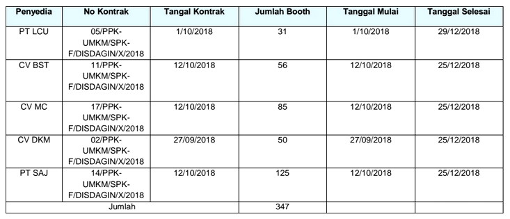 Atas pekerjaan tersebut, Disdagin kota Depok telah mengikat kontrak dengan 5 (lima) penyedia barang/jasa atau pihak ketiga dengan uraian kontrak seperti tertera dalam foto dibawah.