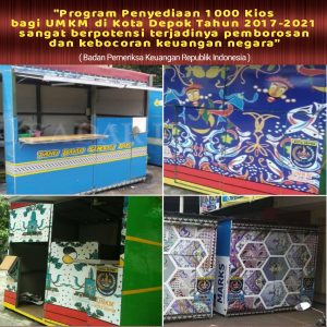 Penyediaan kios bagi UMKM itu direncanakan sebanyak 1.000 unit dan akan dilaksanakan secara bertahap dari tahun 2017 sampai dengan 2021 oleh Dinas Perdagangan dan Perindustrian kota Depok sebagai OPD utama dan dibantu oleh OPD dan instansi terkait lainnya.
