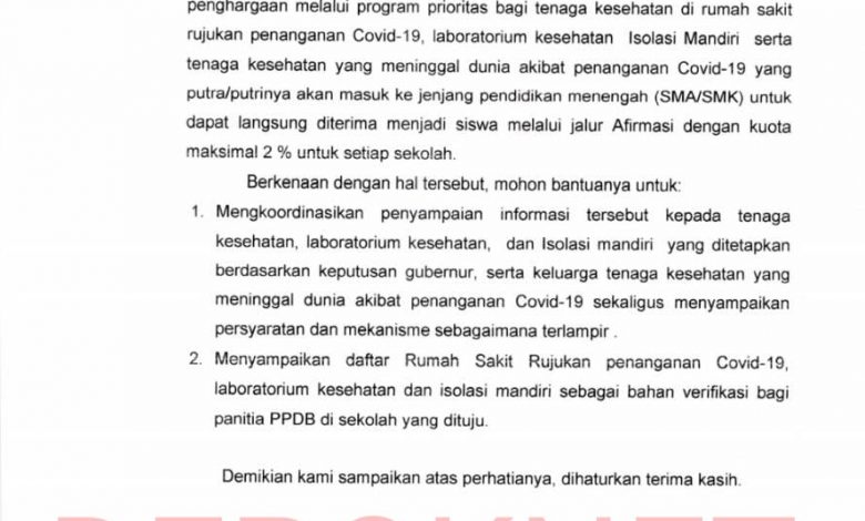 Dalam surat itu disebutkan, Pemprov Jawa Barat melalui Disdik Provinsi Jabar memberikan penghargaan melalui program prioritas bagi tenaga kesehatan di rumah sakit rujukan penanganan Covid 19, laboratorium kesehatan isolasi mandiri serta tenaga kesehatan yang meninggal dunia akibat penanganan Covid 19 di seluruh wilayah Jawa Barat yang putra/putrinya akan masuk ke jenjang pendidikan SMA/SMK untuk dapat Iangsung diterima menjadi siswa melalui jalur Afirmasi dengan kuota maksimal 2 persen untuk setiap sekolah yang ada di wilayah Kabupaten/Kota se Jawa Barat.