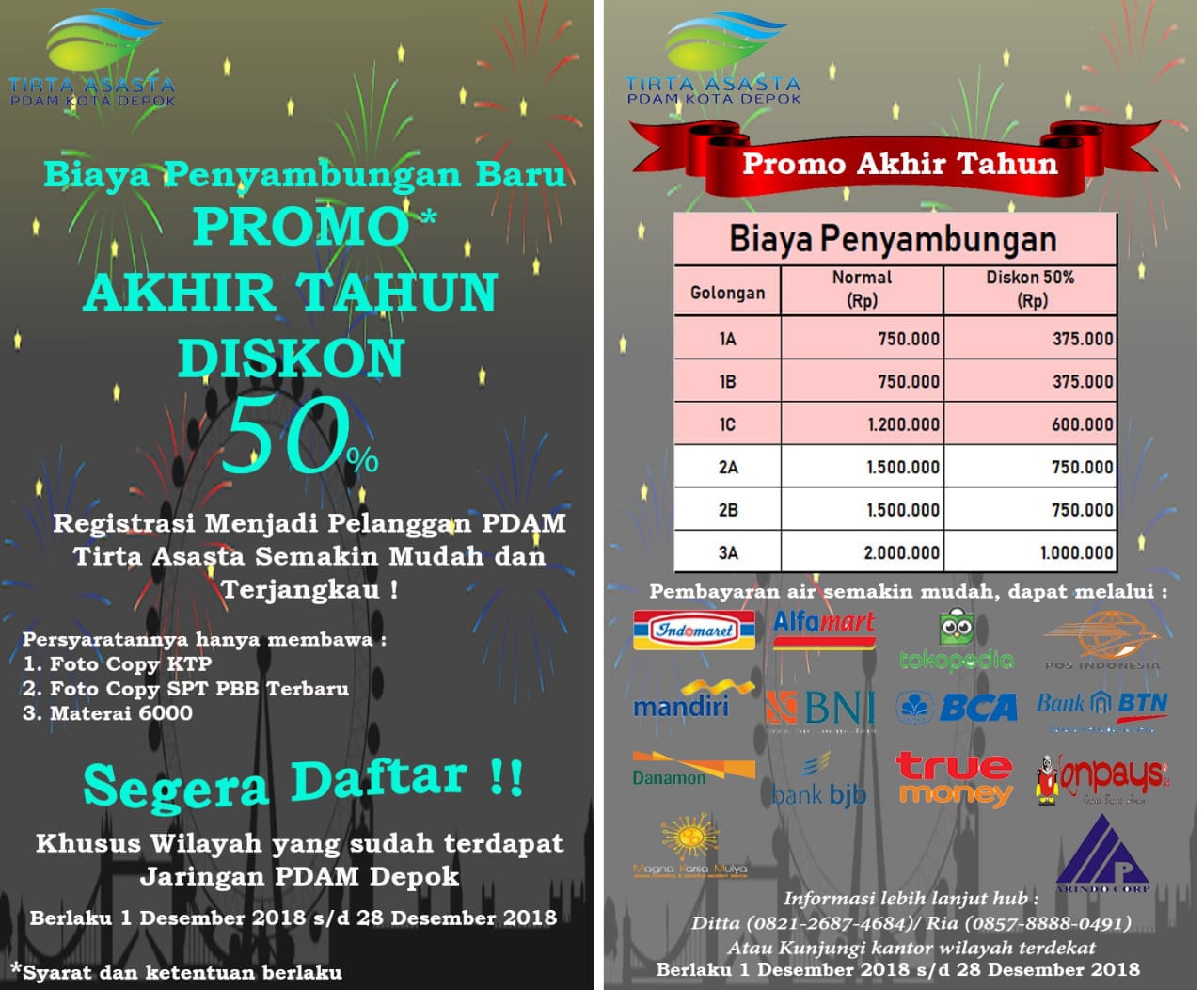 Dalam rangka akhir tahun 2018 PDAM Tirta Asasta Kota Depok mengadakan program diskon 50% khusus utk pelanggan domestik (kelompok sosial dan rumah tangga), yang berlaku selama bulan Desember 2018.