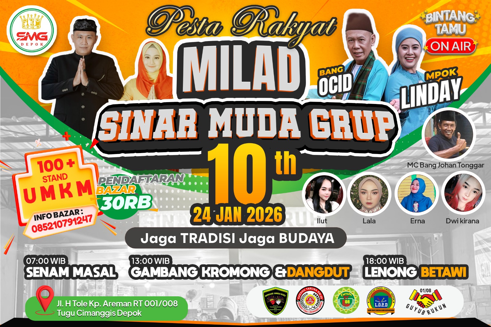 DEPOKNET – Sinar Muda Grup merayakan milad satu dekade nya dengan menggelar pesta rakyat yang memadukan bazar UMKM dan pertunjukan seni budaya di wilayah RW 08, Kelurahan Tugu, Kecamatan Cimanggis, Depok, Sabtu malam (24/1/2026) . Acara ini berhasil menarik antusiasme lebih dari 500 pengunjung serta melibatkan ratusan pelaku usaha UMKM.