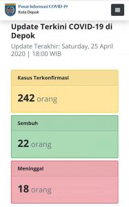 Data terbaru yang di rilis Gugus Tugas Percepatan Penanganan Covid 19 Kota Depok hingga Sabtu (25/4/2020), tercatat kasus terkonfirmasi 242 orang dengan 22 orang dinyatakan sembuh dan 18 meninggal dunia. (Ant/CPB/DepokNet)