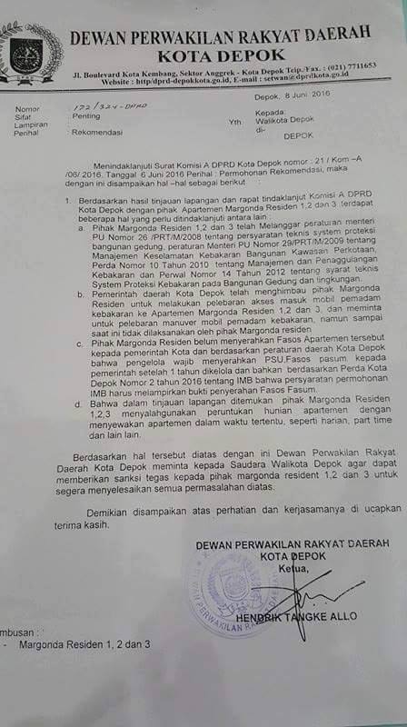 DEPOKNET – Hari ini 8 November 2016, genap lima bulan surat rekomendasi DPRD Kota Depok yang ditujukan kepada Walikota Depok dengan Nomor: 172/324-DPRD tertanggal 8 Juni 2016 Perihal Rekomendasi terkait Apartemen Margonda Residence (Mares) 1 dan 2 yang dinyatakan melanggar Peraturan Perundang-undangan diantaranya Peraturan Daerah (Perda) Nomor 10 Tahun 2010 tentang Manajemen Penanggulangan Kebakaran dan Peraturan Walikota Nomor 14 Tahun 2012 tentang Syarat Teknis Sistem Proteksi Kebakaran Pada Bangunan Gedung dan Lingkungan belum juga ditindak lanjuti oleh Walikota dan pihak Pengelola Mares.