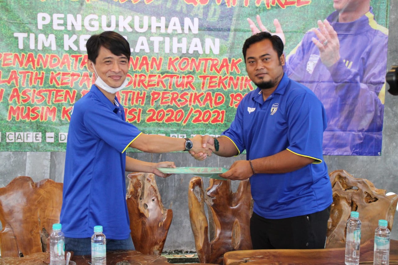 Pengukuhan tim kepelatihan tersebut juga dirangkai dengan proses penandatanganan kontrak Pelatih Kepala, Asisten Pelatih, Pelatih Kiper dan Pelatih Fisik, yang digelar di Louis Cafe, kelurahan Depok, Jumat (27/3/2020).