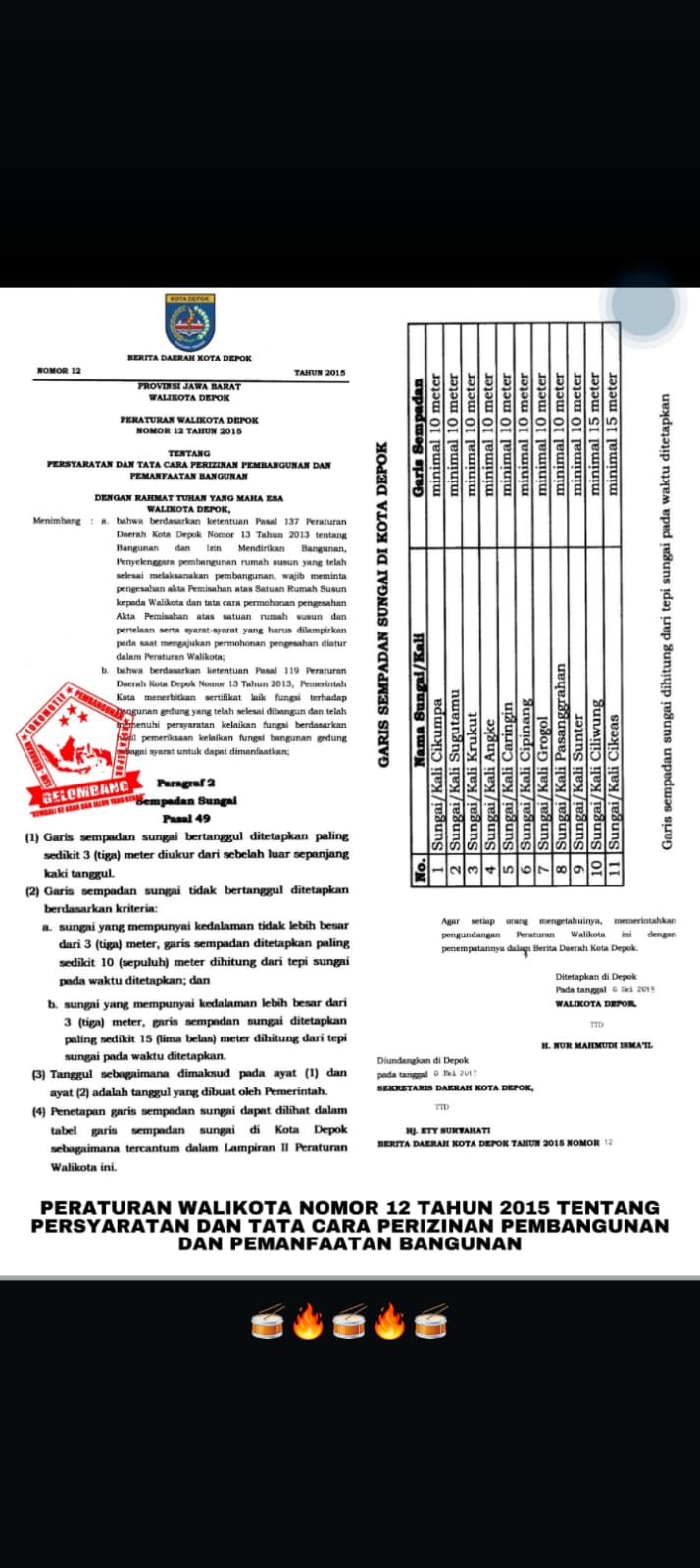 DEPOKNET- Terkait Bangunan Outlet SAMBAL BAKAR INDONESIA yang berada di wilayah Grand Depok City (GDC) dan melanggar Garis Sempadan Sungai (GSS) karena berada tepat dipinggir kali sungai Ciliwung. Hal ini karena jelas di Peraturan Perundang-Undangan yang berlaku *Peraturan Walikota Depok Nomor 12 Tahun 2015 tentang Persyaratan dan Tata Cara Perizinan Pembangunan Dan Pemanfaatan Bangunan*, khususnya pada Paragraf 2 perihal Garis Sempadan Pasal 49 ayat 2 butir b.