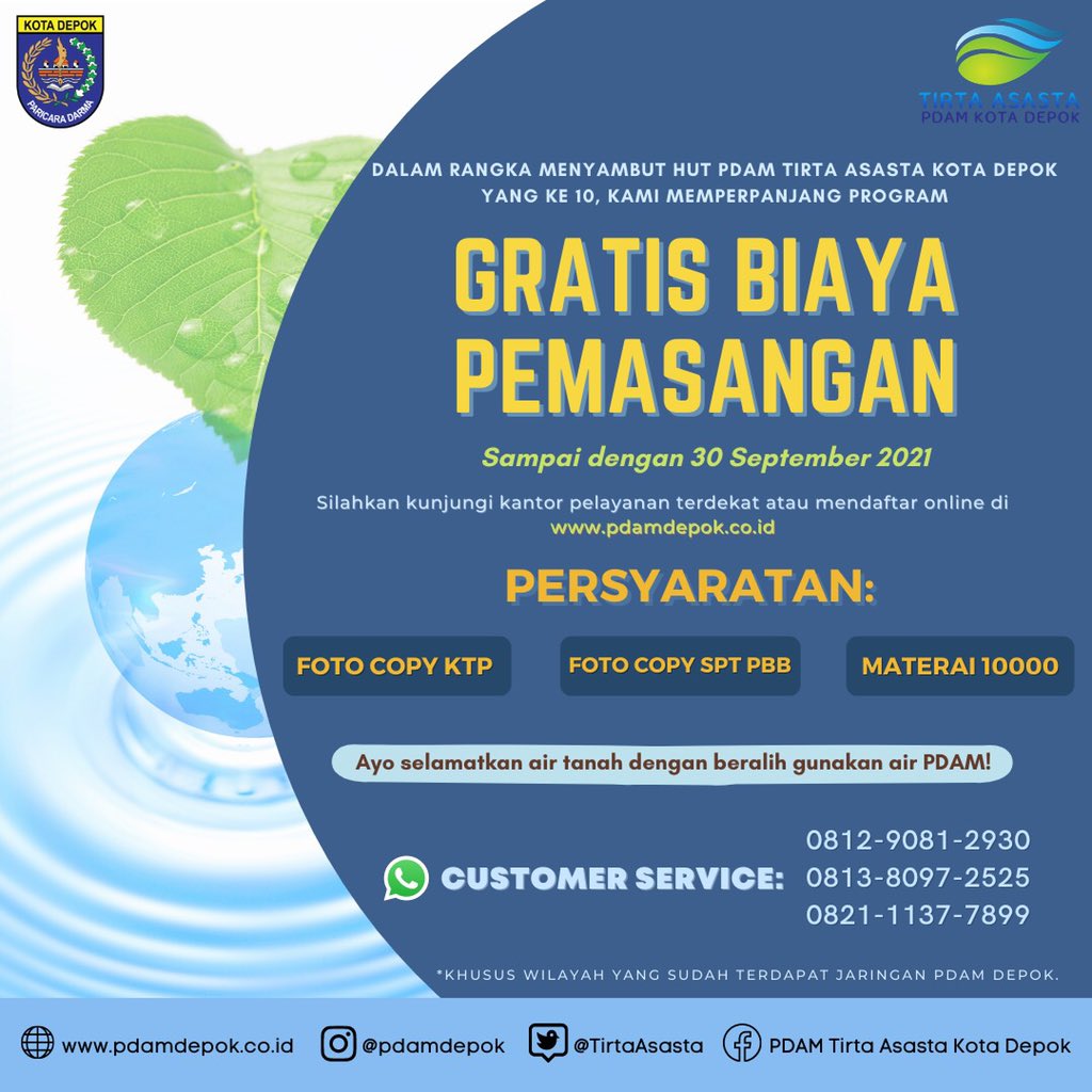 DEPOKNET – Dalam rangka menyambut Hari Ulang Tahun (HUT) ke 10, PDAM Tirta Asasta kota Depok kembali memperpanjang program gratis biaya pemasangan baru sampai dengan 30 September 2021.