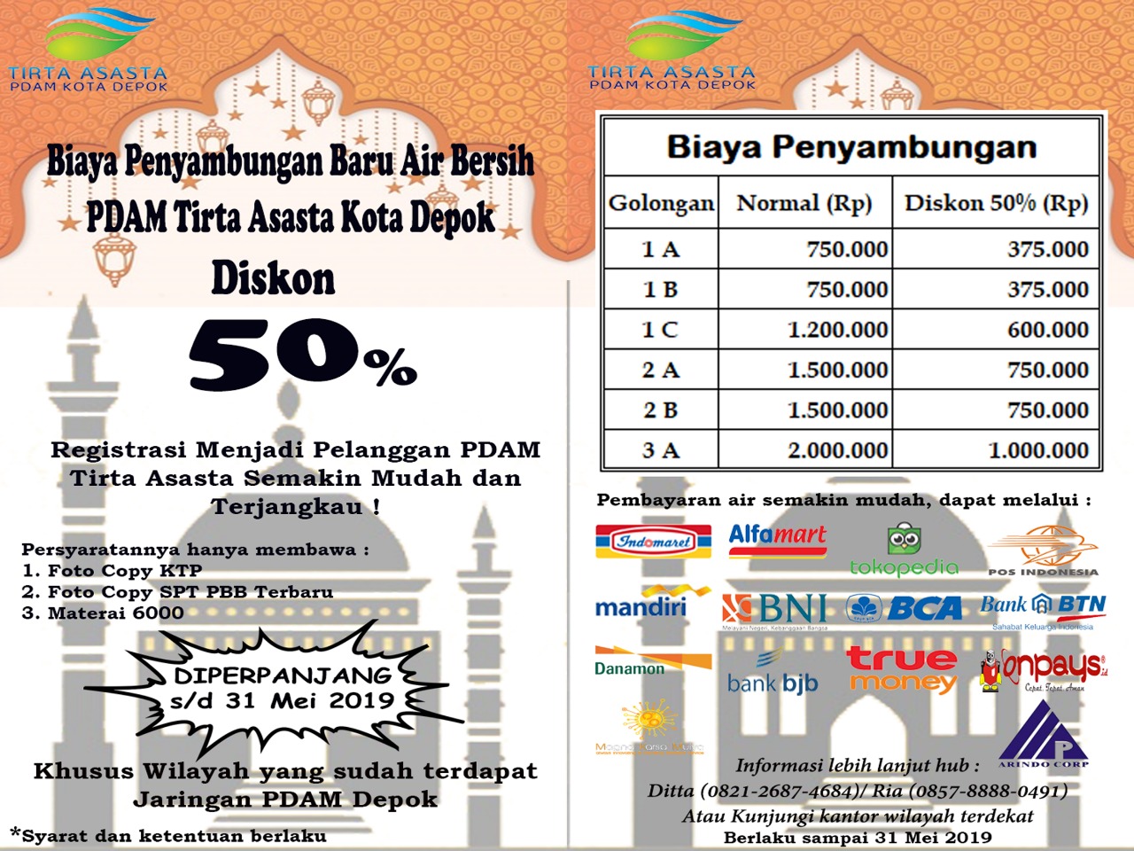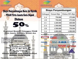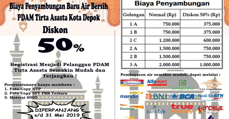 DEPOKNET – Setelah menggelar diskon penyambungan baru dalam rangka HUT kota Depok ke 20, PDAM Tirta Asasta kota Depok kembali menggelar diskon 50 persen selama bulai Mei 2019.