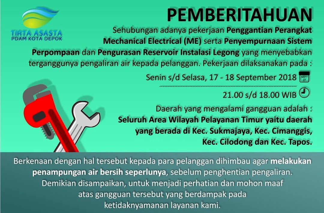 DEPOKNET – Lebih kurang 46 ribu pelanggan PDAM Tirta Asasta kota Depok akan mengalami gangguan aliran air, Senin-Selasa, 17-18 September 2018 mulai pukul 21:00 WIB.